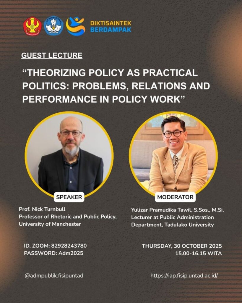 PALU – Program Studi Administrasi Publik Fakultas Ilmu Sosial dan Ilmu Politik Universitas Tadulako sukses menyelenggarakan Guest Lecture internasional sebagai bagian dari program DIKTISAINTEK BERDAMPAK. Acara ini memberikan wawasan mendalam mengenai teori dan praktik kebijakan publik kontemporer.