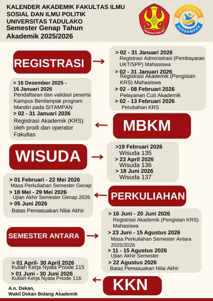 Palu – Fakultas Ilmu Sosial dan Ilmu Politik melanjutkan rangkaian peningkatan mutu layanan dengan menggelar Workshop Penyusunan Standar Operasional Prosedur (SOP) Layanan Akademik. Kegiatan ini bertujuan untuk menstandarisasi seluruh proses akademik, mulai dari pendaftaran mata kuliah hingga proses yudisium. Komitmen Dekanat dalam Penjaminan Mutu Workshop yang berfokus pada efisiensi dan transparansi proses akademik ini dihadiri oleh berbagai unsur penting di lingkungan FISIP, meliputi mahasiswa, dosen, tenaga kependidikan (tendik), Ketua Unit Penjaminan Mutu, Koordinator Program Studi, dan Ketua Jurusan di lingkungan fakultas. Partisipasi menyeluruh ini menjamin bahwa SOP yang disusun akan realistis dan dapat diterapkan oleh semua pihak. Bedah Tuntas Prosedur Akademik Sebagai pemateri utama, panitia menghadirkan Dr. Moh. Irfan Mufti, M.Si., yang menjabat sebagai Wakil Dekan Bidang Akademik. Dr. Irfan Mufti memimpin pembahasan mendalam mengenai alur dan prosedur standar yang harus ada dalam layanan akademik. Materi yang disampaikan meliputi penyusunan SOP untuk: Sesi workshop diisi dengan diskusi interaktif antara pemateri dan peserta. Masukan dari dosen berfokus pada kemudahan integrasi SOP dengan Sistem Informasi Akademik, sementara masukan dari mahasiswa menyoroti aspek kecepatan dan aksesibilitas layanan. Diharapkan, hasil penyempurnaan SOP Layanan Akademik ini akan segera disahkan dan diimplementasikan untuk meningkatkan efisiensi kerja dosen dan tendik, sekaligus menjamin kualitas pelayanan yang diterima oleh mahasiswa FISIP Universitas Tadulako.